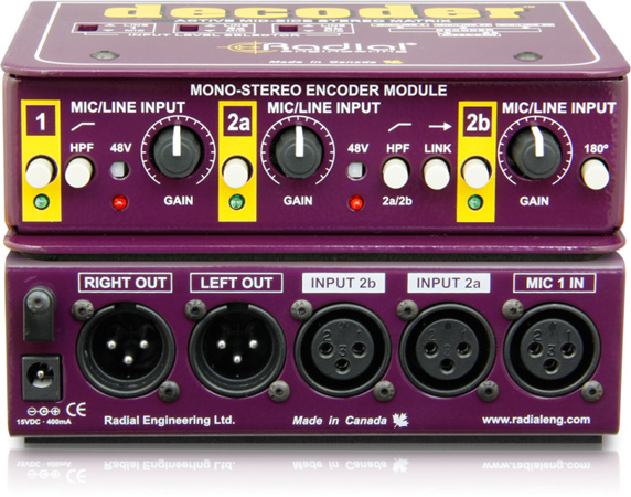 The Radial Decoder is a microphone preamp and mid/side stereo matrix that allows the user to easily create M/S recordings without having to re-configure a recording console. Featuring built-in mic pre’s with phantom power and independent level control, the Decoder automatically combines the signals to a stereo output using the sum-difference method for spectacular stereo imaging that translates well to mono for broadcast.