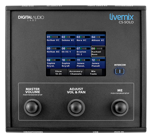 The Livemix CS-SOLO is simple to use and full of professional features. The LCD touchscreen, with custom naming, makes creating a mix easy. Dedicated knobs provide quick access to essential features. The CS-SOLO provides 24 channels plus accessory channels, each with EQ and compression.