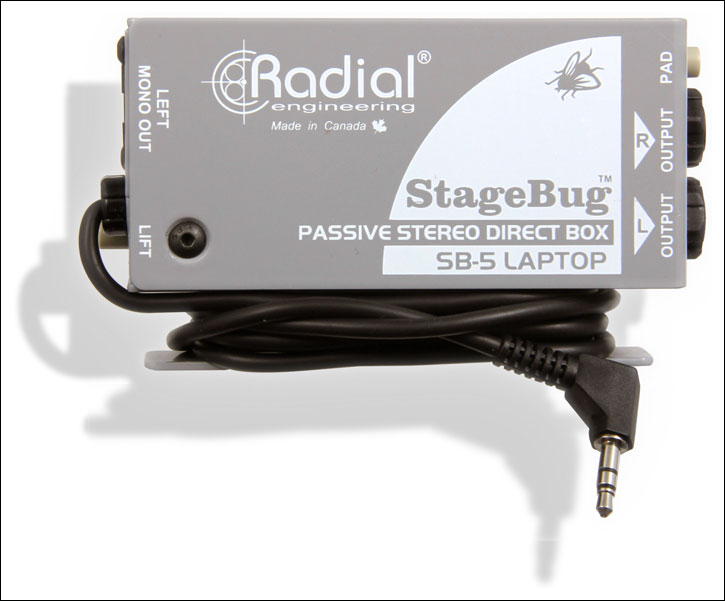 The StageBug SB-5 Laptop DI from Radial Engineering is a compact stereo direct box designed to accommodate laptop computers, tablets, and other consumer audio products when amplifying the signal through a PA system.